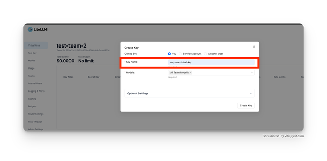 - Create Virtual Key on LiteLLM either through the LiteLLM Admin UI or API